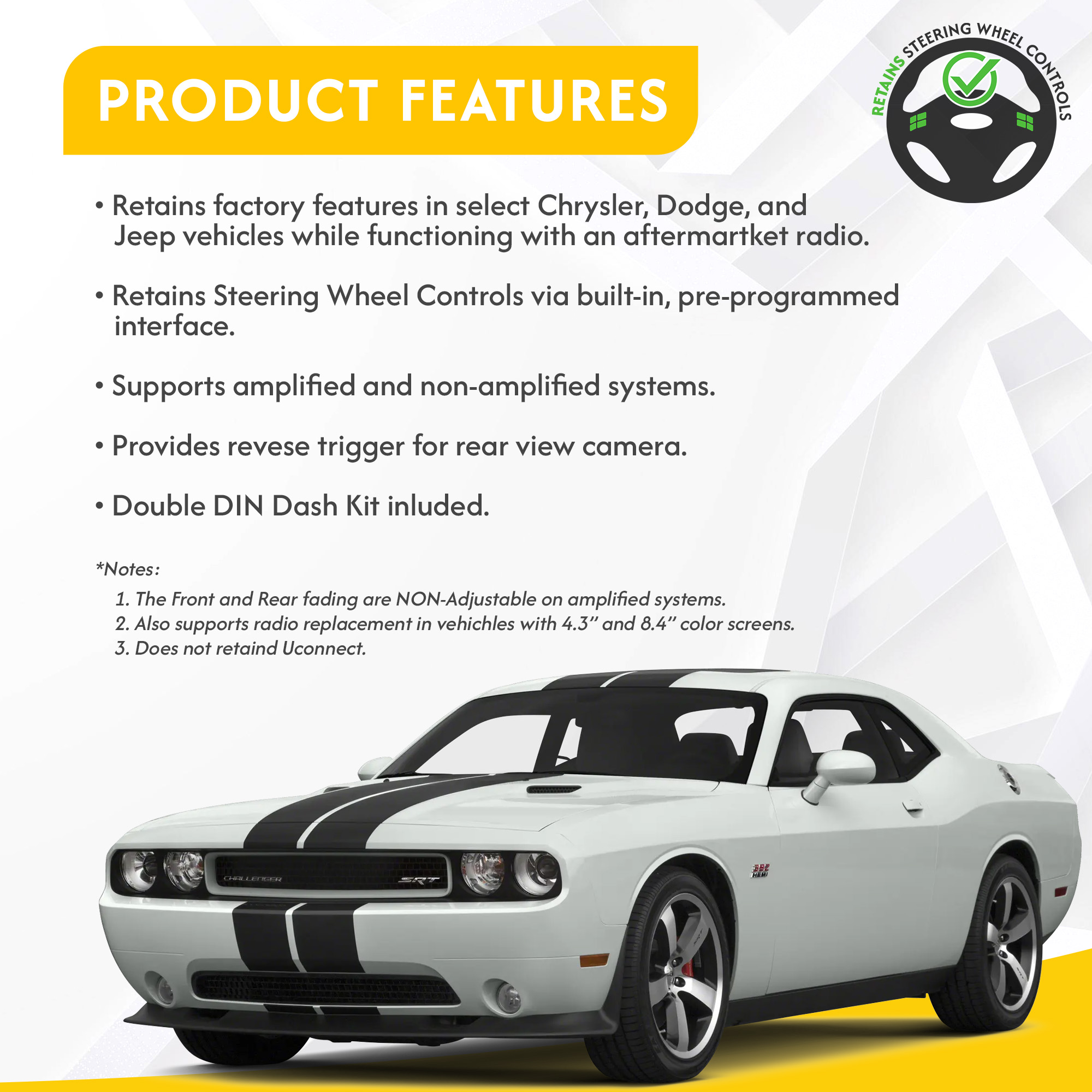 Retains factory features in select Chrysler, Dodge and Jeep vehicles while functioning with an aftermarket radio.