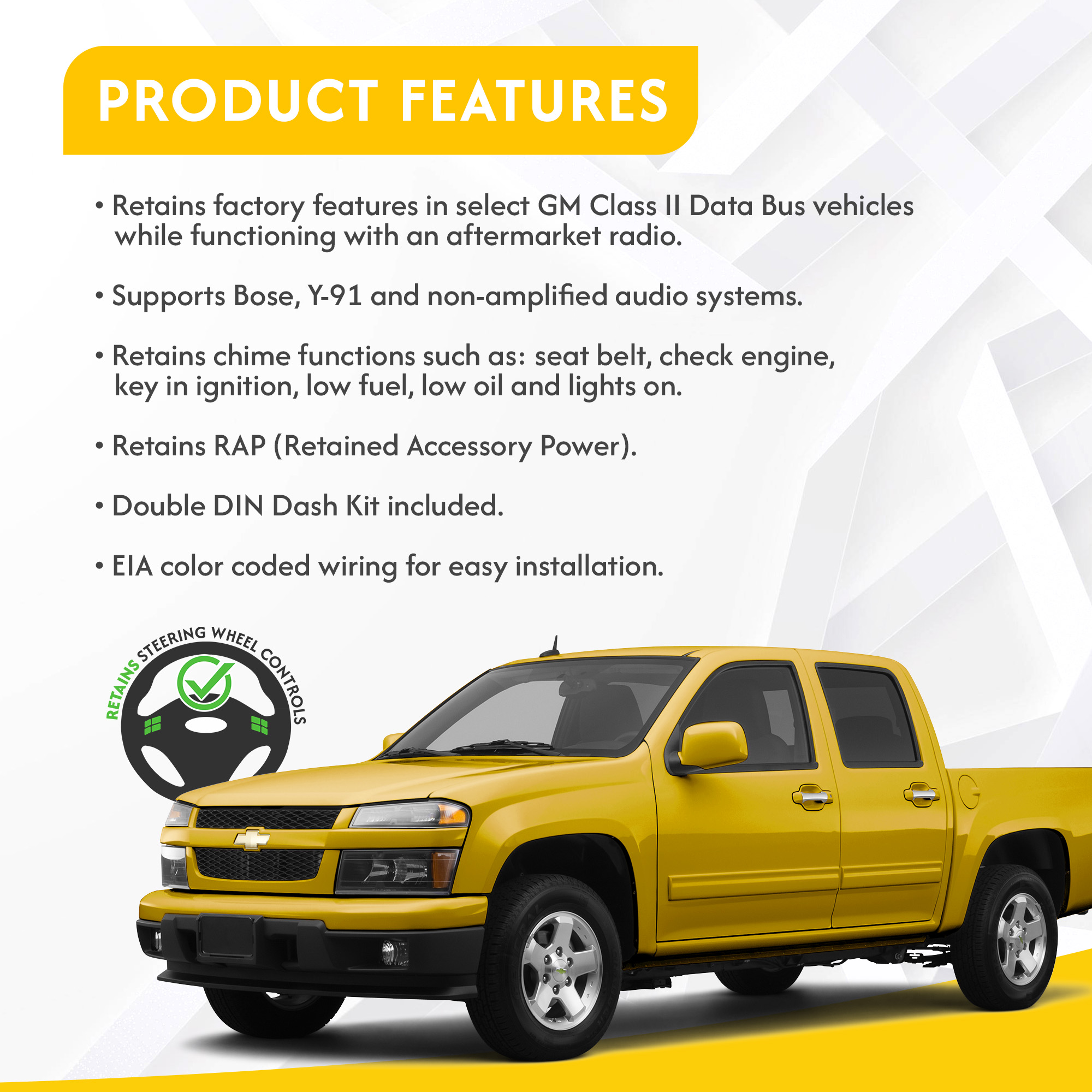 - – Retains factory features in select GM Class II Data Bus vehicles while functioning with an aftermarket radio.