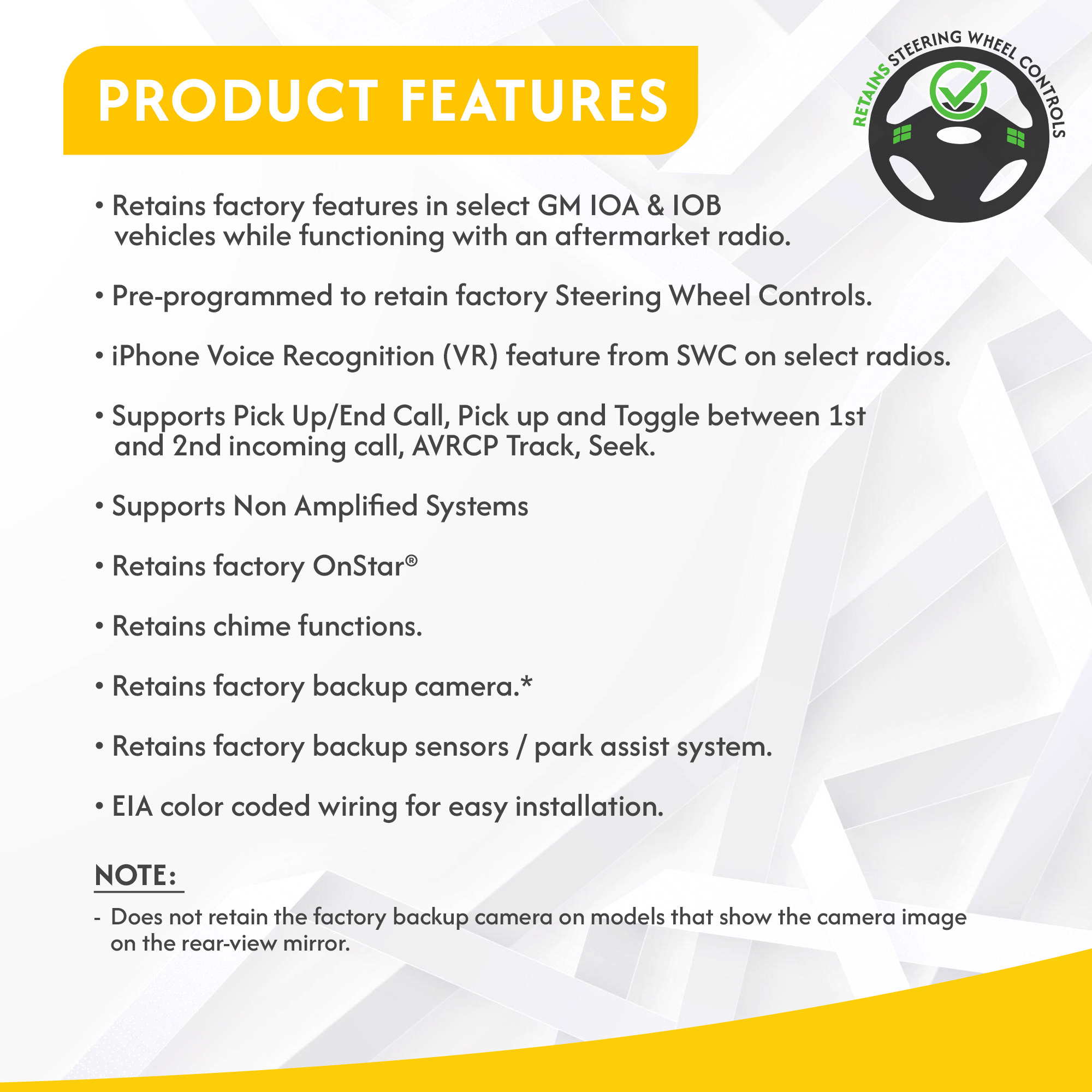 – Retains factory features in select GM IOA & IOB vehicles while functioning with an aftermarket radio.