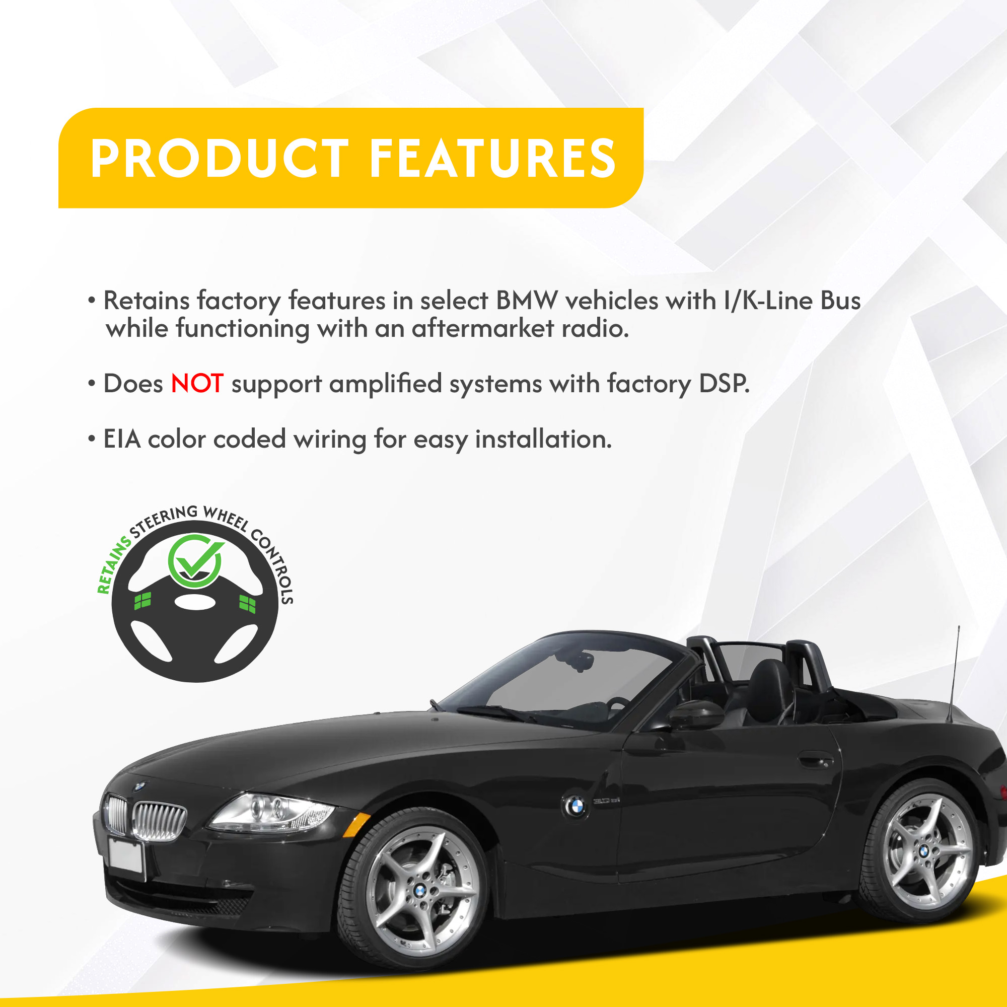- Retains factory features in select BMW vehicles with I/K-Line Bus while functioning with an aftermarket radio.