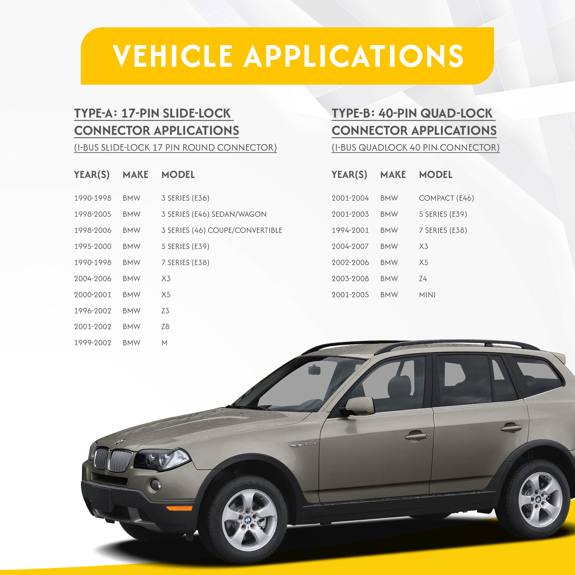 2001 – 2006 Compact (E46) 1998 – 2005 3 Series (E46) 2001 – 2003 5 Series (E39) 1994 – 2001 7 Series (E38) 2004 – 2007 X3 2002 – 2006 X5 2003 – 2008 Z4 2001 – 2005 Mini |