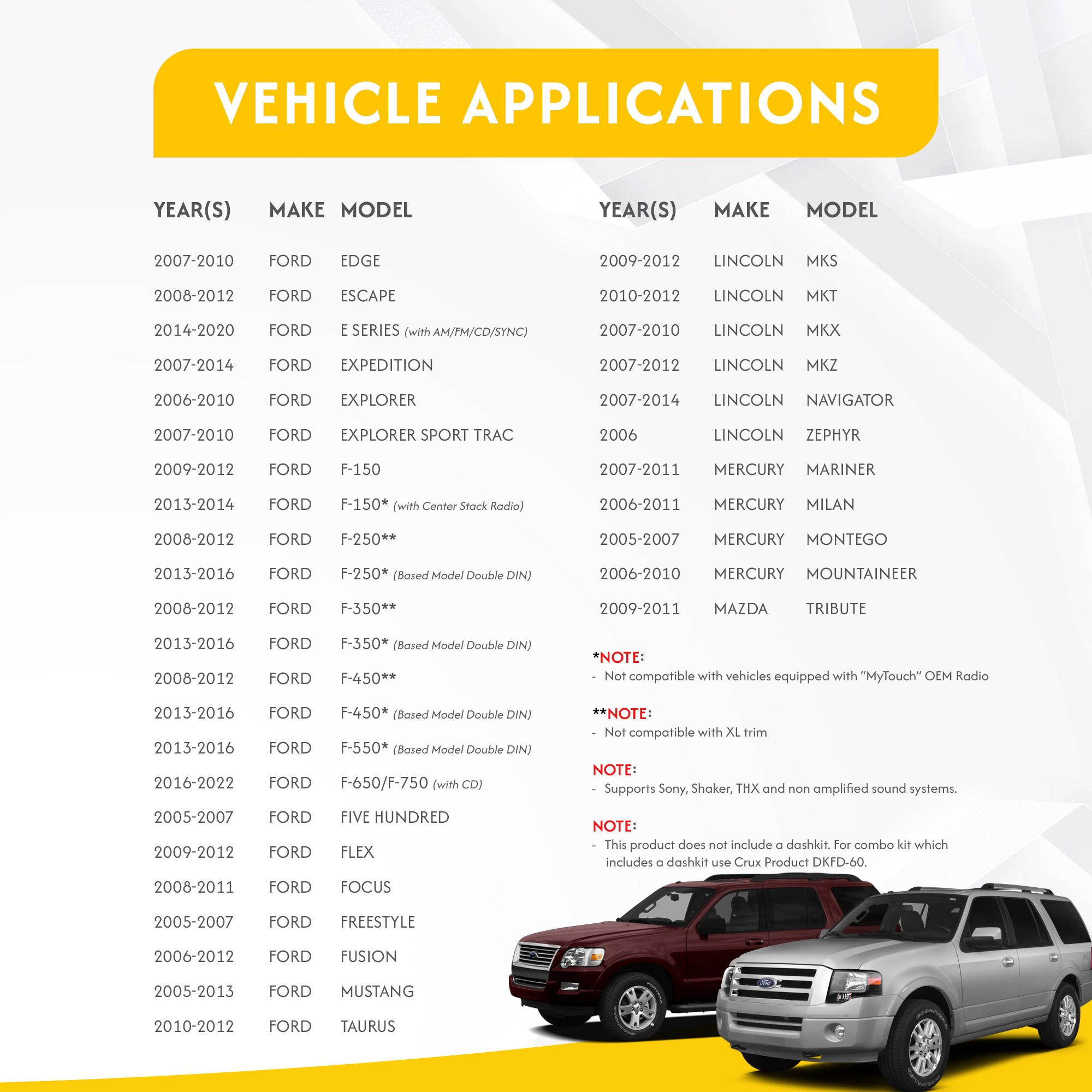 This product does not include a dash kit. For combo kit which includes a dash kit use Crux Product DKFD |