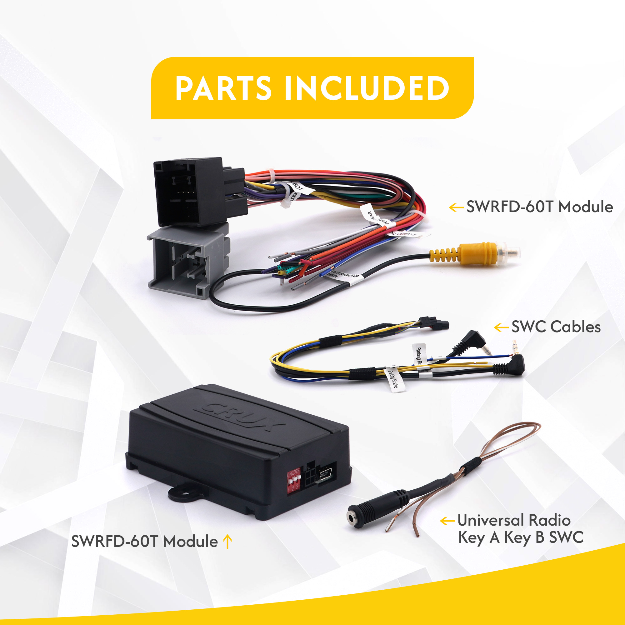 The CRUX SWRFD-60T is a radio replacement interface for select 2020 & UP Ford Vehicles. It facilitates the integration of an aftermarket radio to retain factory features in select models. The interface is also pre-programmed for the retention of steering wheel controls and provides illumination and revere output.