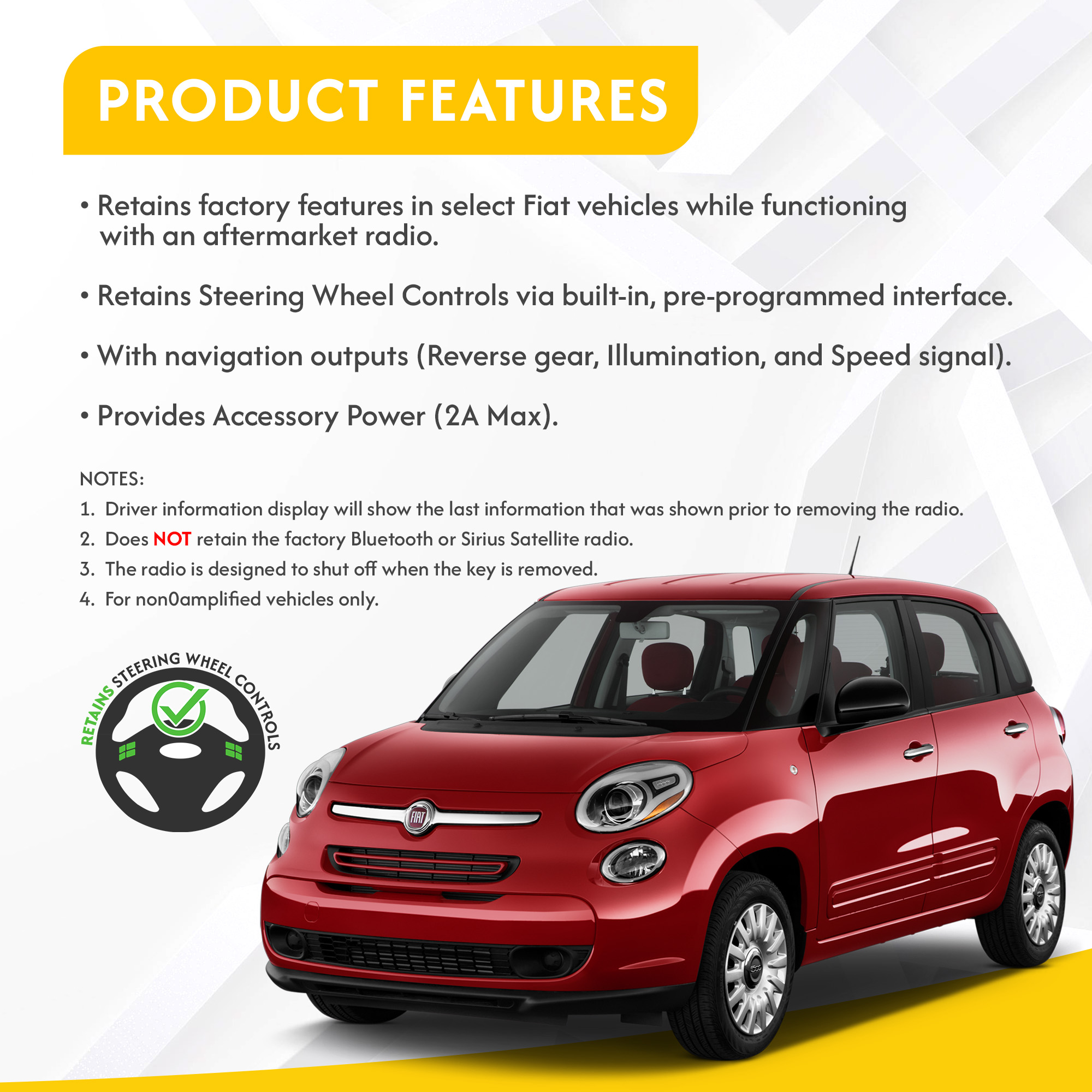 - Retains factory features in late model Fiat vehicles while functioning with an aftermarket radio