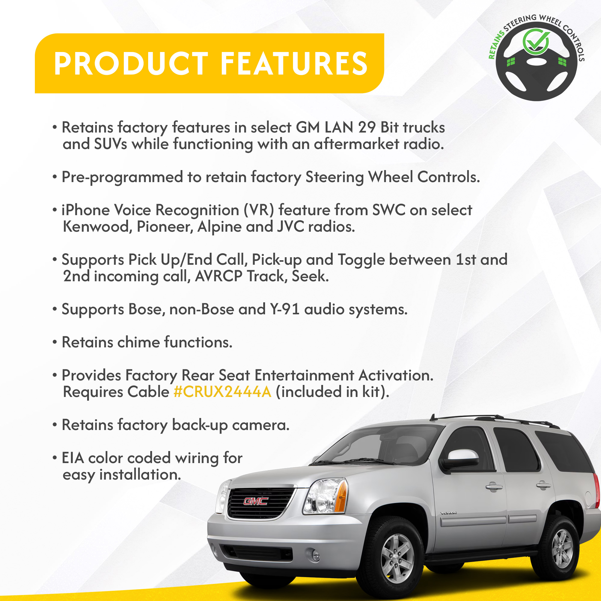 - Retains factory features in select GM LAN 29 Bit trucks and SUV’s while functioning with an aftermarket radio.
