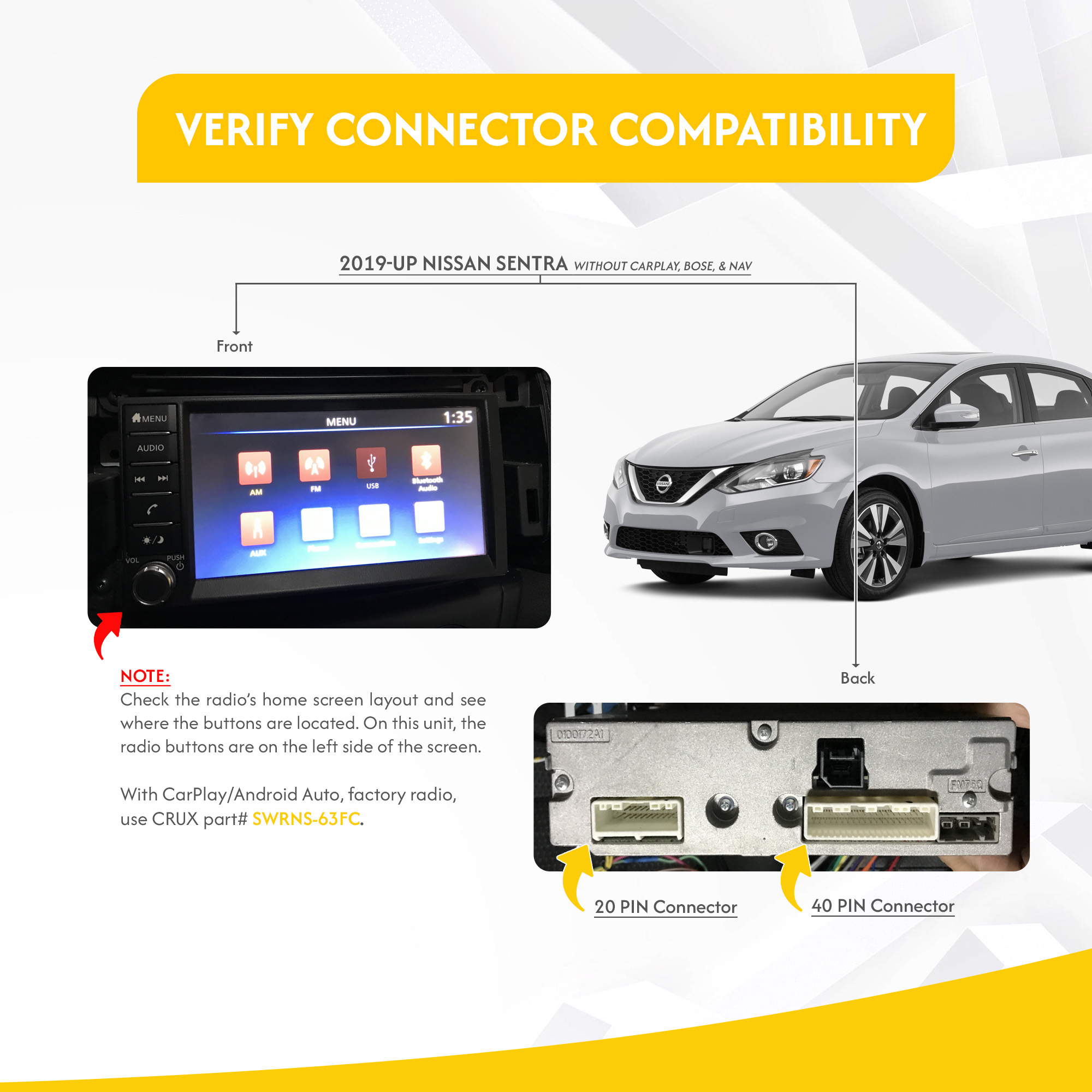 2019-Up Sentra w/o Bose, Carplay, & Navigation Notes: Not compatible with 40 & 20 pin Nissan Sentra with Carplay please use Crux part number SWRNS-63FC |