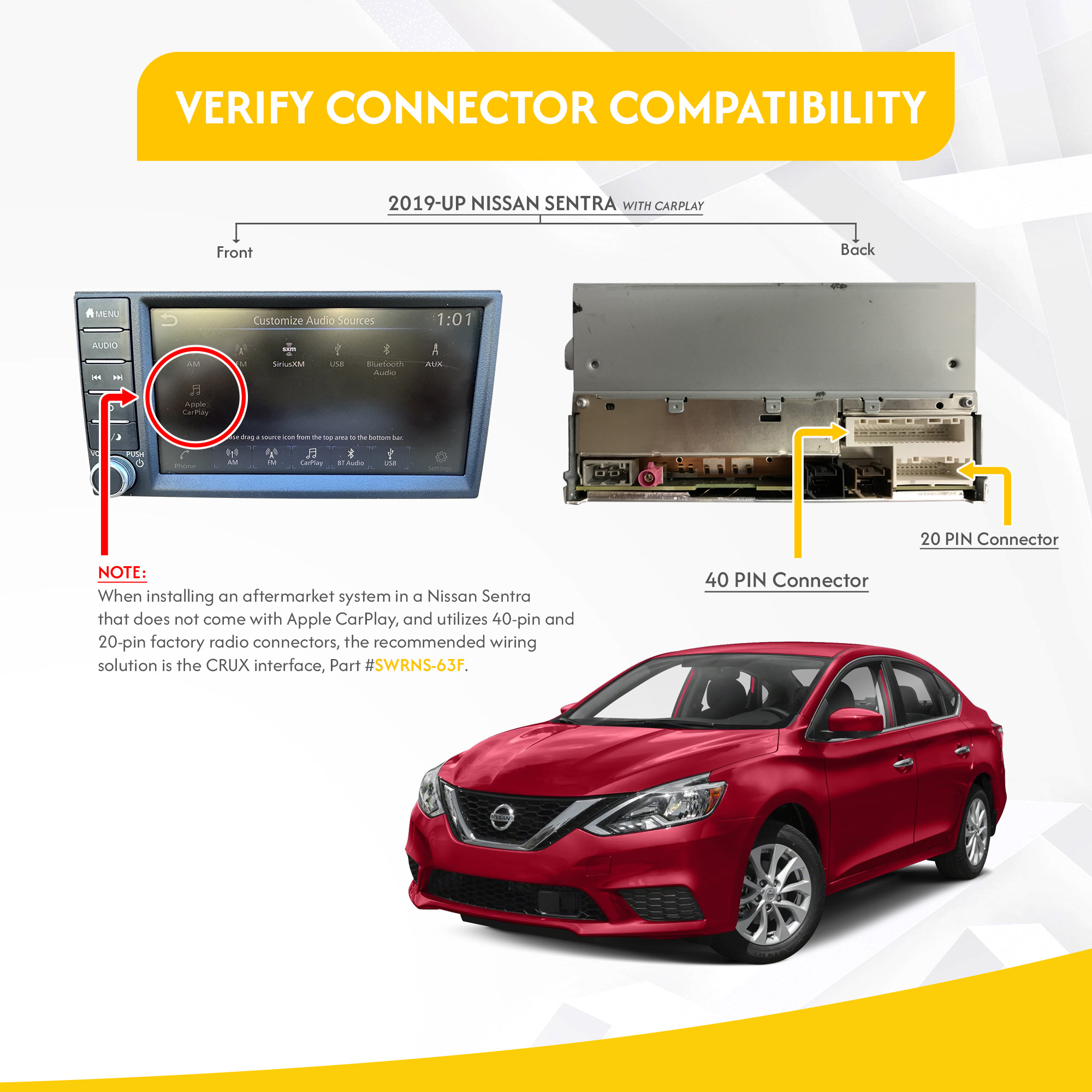 2019-Up Sentra w/o Bose with Carplay, & Navigation 2019-Up Sentra with Bose, Carplay, & Navigation 2020 – 2020 Altima 2022 – 2024 Frontier 2019 – 2022 Maxima 2019 – 2021 Titan Notes: Not compatible with 40 & 20 pin Nissan Sentra without Carplay please use Crux part number SWRNS-63F |