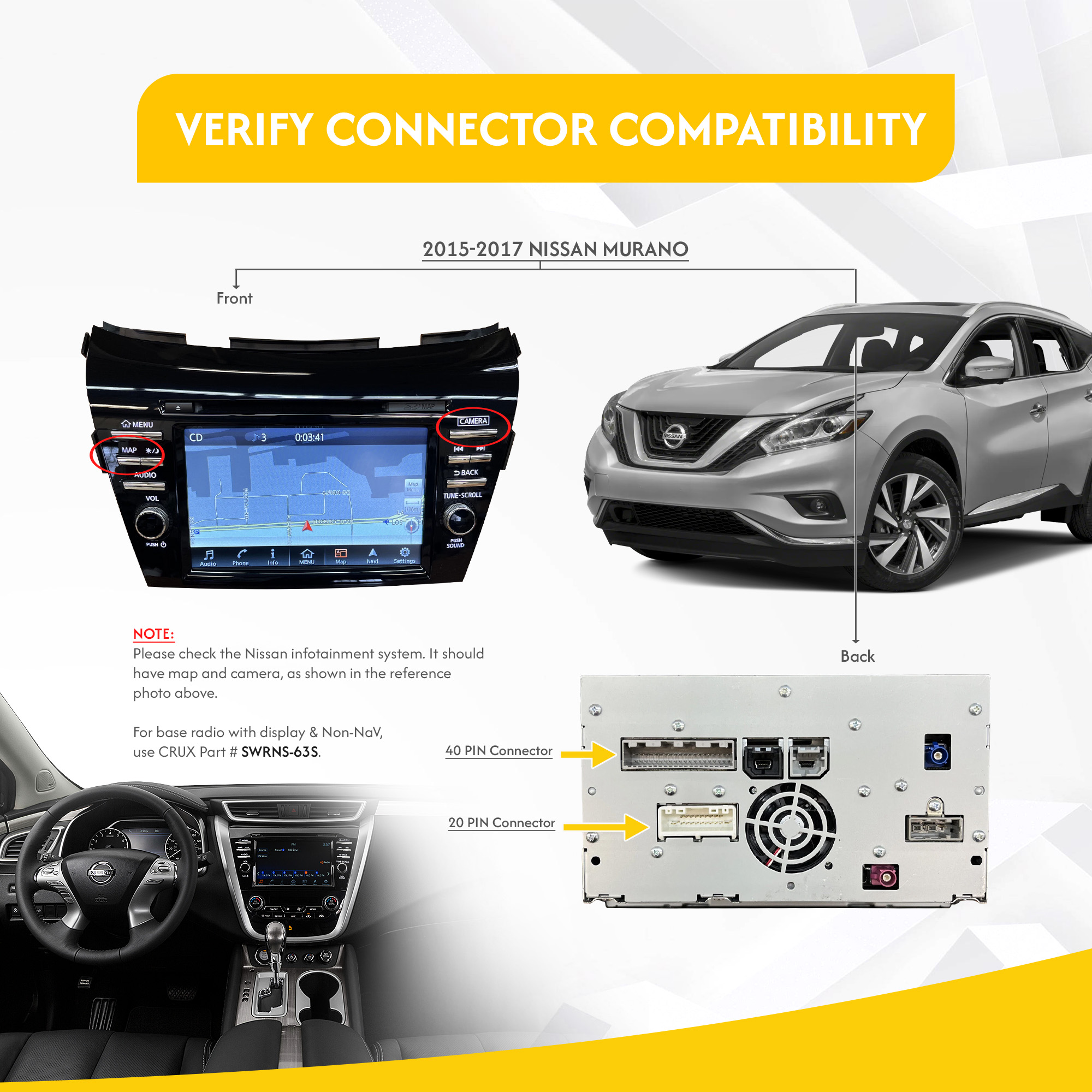 2015 – 2017 Murano Base radio w/ Nav w/o Bose 2015 – 2017 Murano w/ Bose w/ Nav NOTES: For base radio w/ display & Non-Nav use CRUX Part #SWRNS-63S