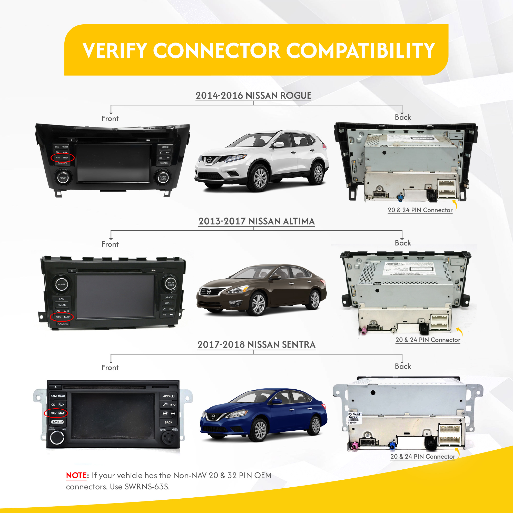 2013 – 2017 Altima w/ Bose and w/ Nav 2014- 2019 Versa w/ Nav Notes: Not compatible with 16 & 20 pin Nissan Altima & Versa vehicles without display. Please use Crux part number SWRNS-63A Not compatible with Nissan Altima, Rogue, Sentra, & Versa vehicles equipped with display & has 32 & 20 pin connector please use crux part number SWRNS-63S Not compatible with Nissan Murano Vehicles equipped with Navigation please use crux part number SWRNS-63M Not compatible with Nissan Sentra vehicles equipped with Carplay please use Crux part number SWRNS-63FC |