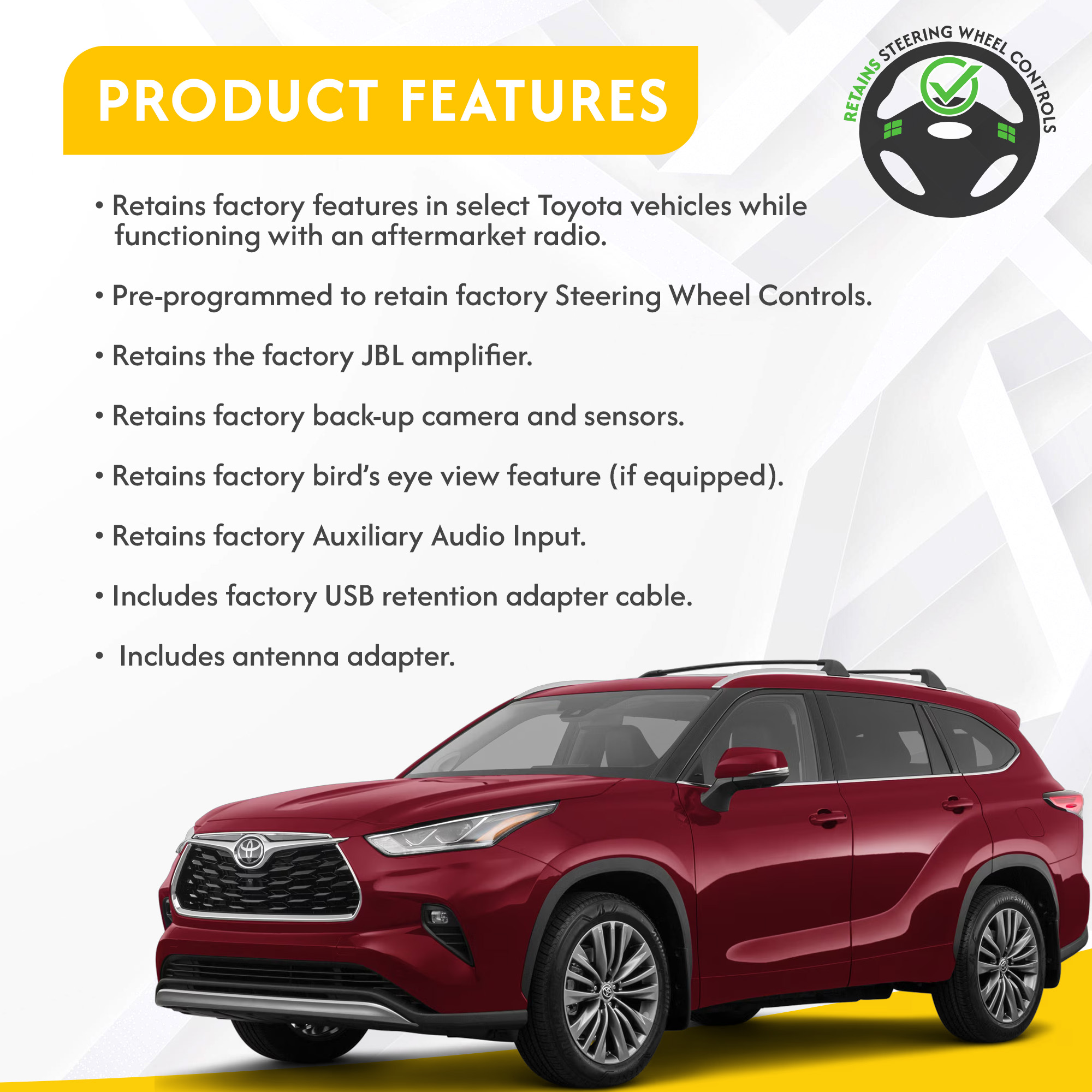 – Retains factory features in select Toyota vehicles while functioning with an aftermarket radio.