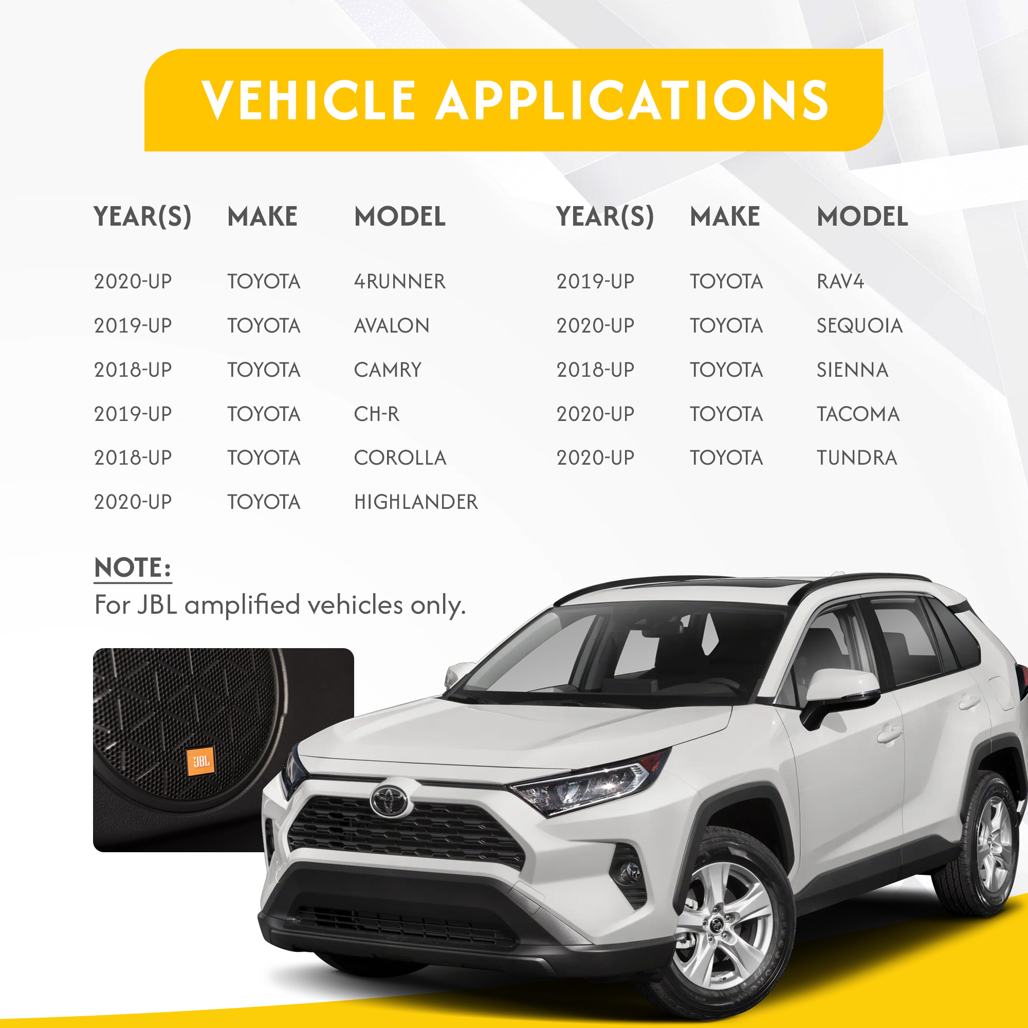 This unit retains factory JBL amplifer if your vehicle is not equipped with factory JBL amplifier please select SWRTY-61C